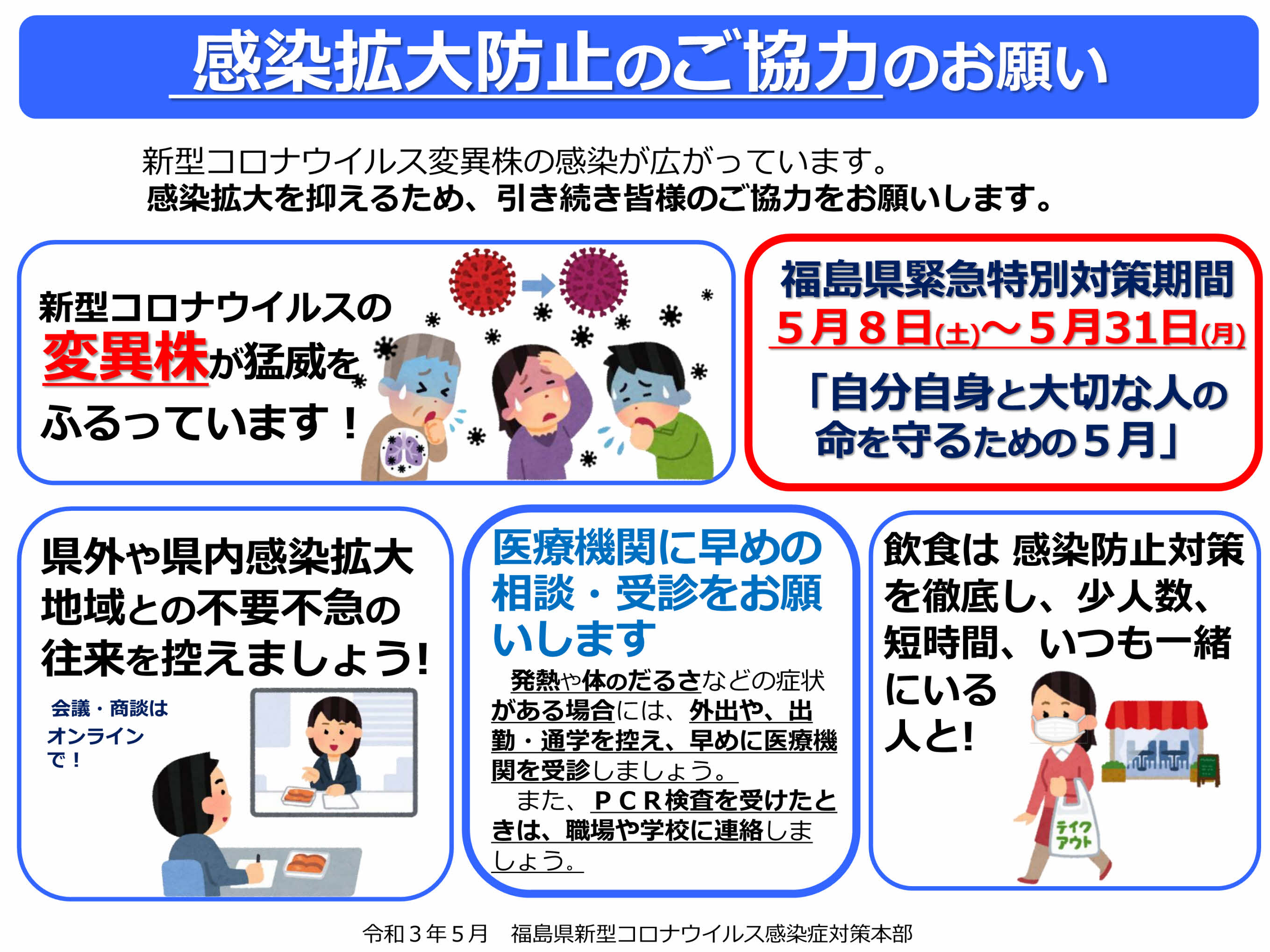 福島市、いわき市における新型コロナウイルス感染症集中対策 郡山市における新型コロナウイルス感染症集中対策 夏休み・お盆を安全に過ごすためのお願い 令和3年7月30日 大雨警報による被害状況即報 福島県感染拡大防止対策